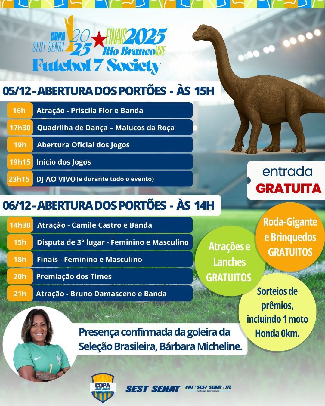 O Sest Senat Rio Branco promove neste fim de semana as finais da Copa Sest Senat, considerada a maior competição de futebol amador do Brasil. As semifinais serão disputadas na sexta, 5, a partir das 19 horas, e terão os seguintes confrontos: Vitlog(BA) x Vega(CE) e Asatur Transportes(RR) x São Cristovão(MG), no feminino, e Ísis Transportes e Locação(SP) x Rodofrota Transportes e Logísticas(PR) e Viação Conquistadora(RS) x Apoio Transportes(BA). As decisões serão no sábado,6, a partir das 15 horas.